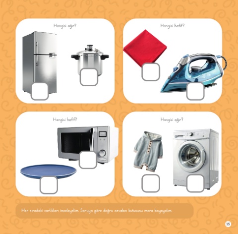 Hangisi ağır? Hangisi hafif? Hangisi hafif? Hangisi ağır? Her sıradaki varlıkları inceleyelim. Soruya göre doğru cevabın kutusunu mora boyayalım. 35